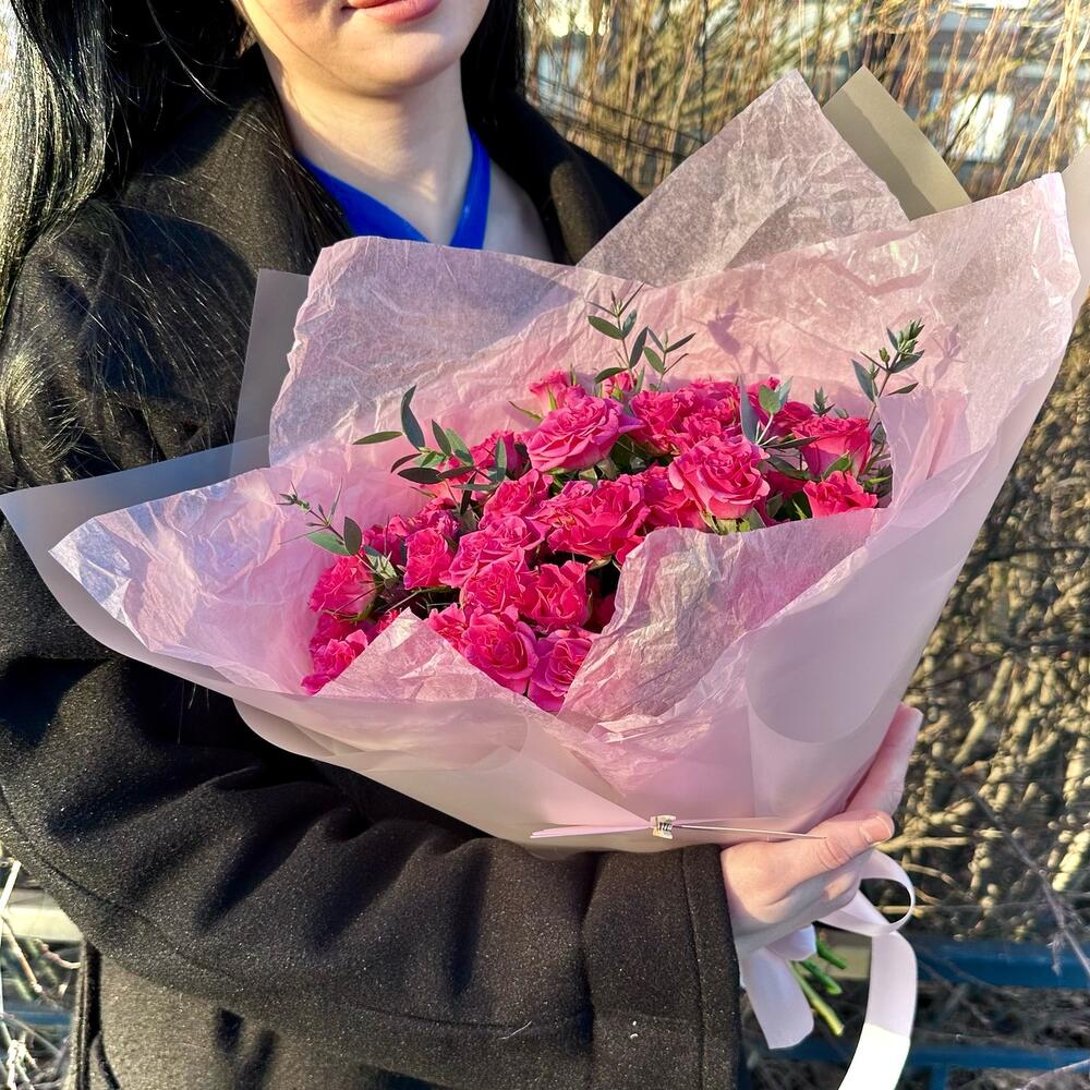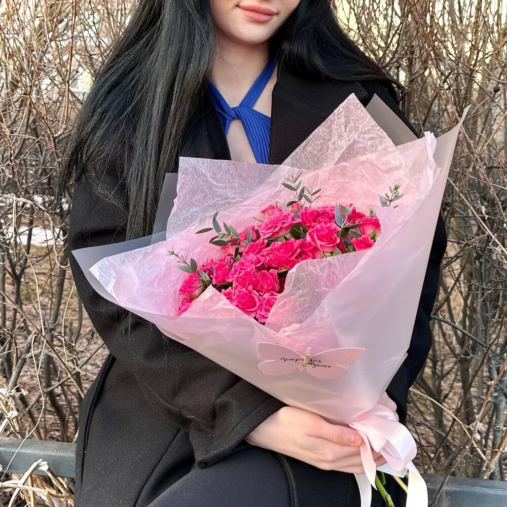 11 розовых кустовых роз с эвкалиптом