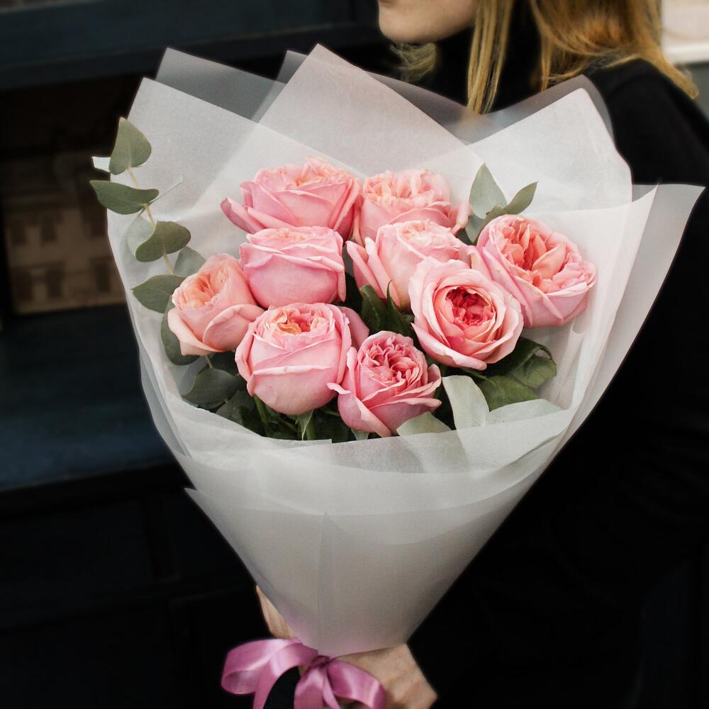 9 розовых пионовидных роз с эвкалиптом