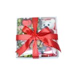 игрушка ручная – 1 шт. пионорозы – 4 шт. Гипсофила – 3 шт. Конфеты – 5 шт. Коробка – 1 шт.