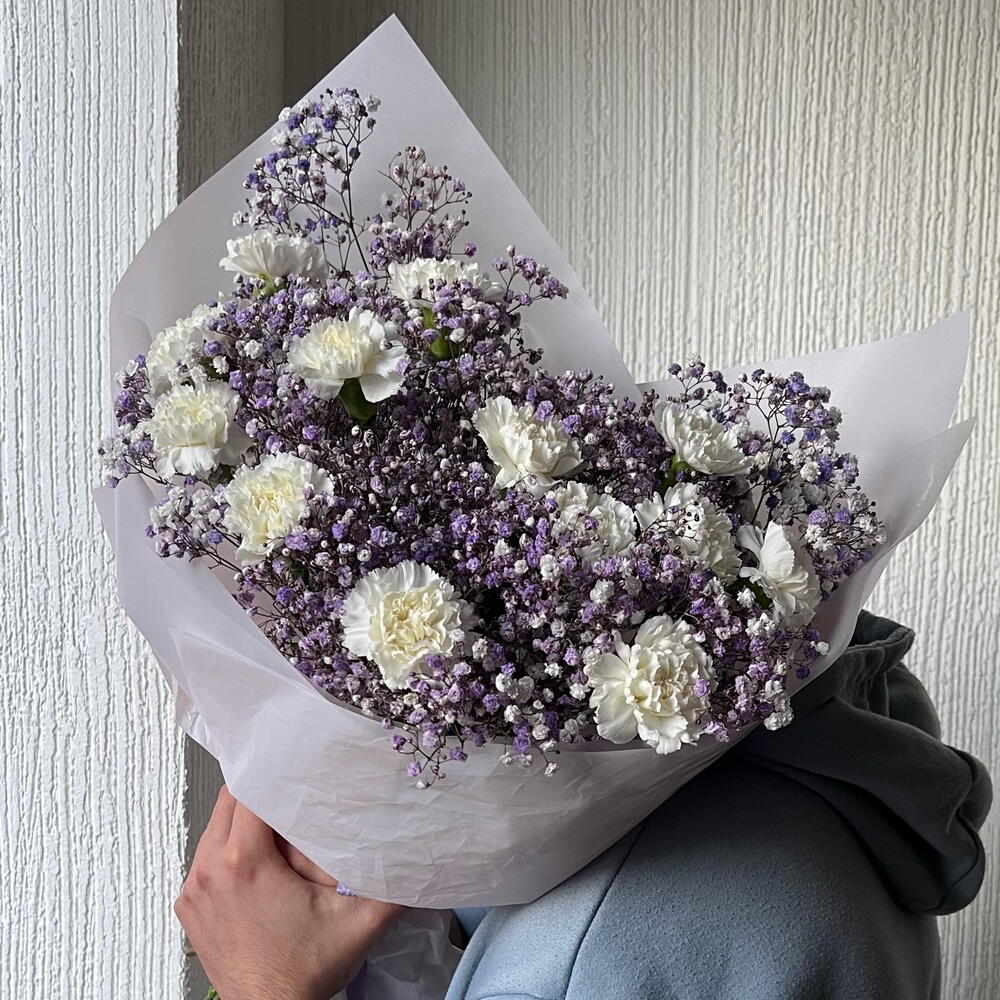 «Лавандовое созвездие» Букет из розы, гвоздики, статица и хлопка