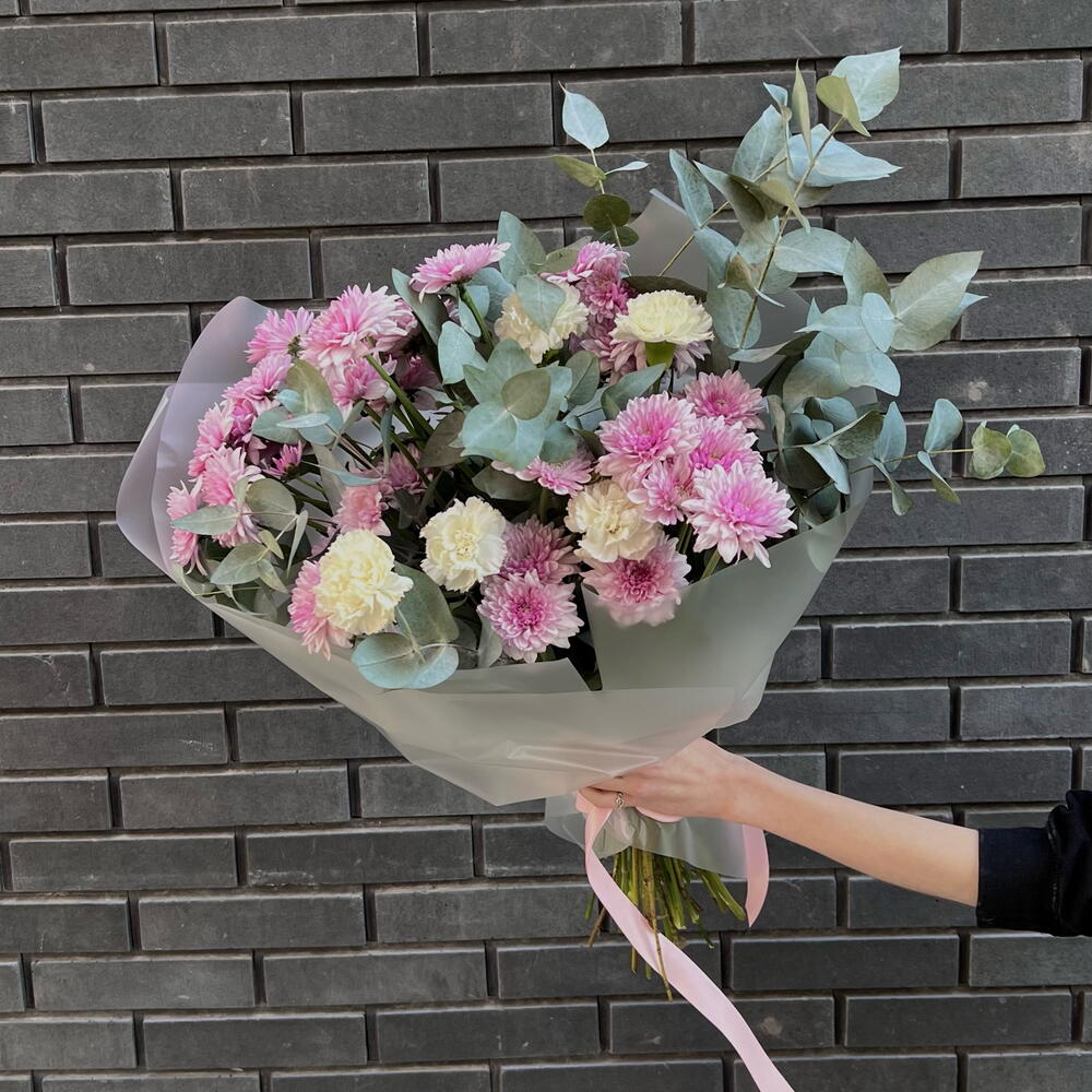 11 нежно-розовых диантусов с эвкалиптом