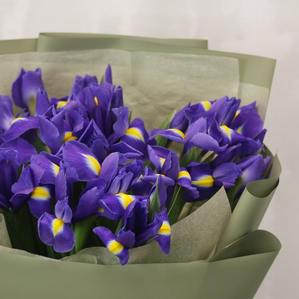 Букет из 25 синих ирисов в стильной упаковке