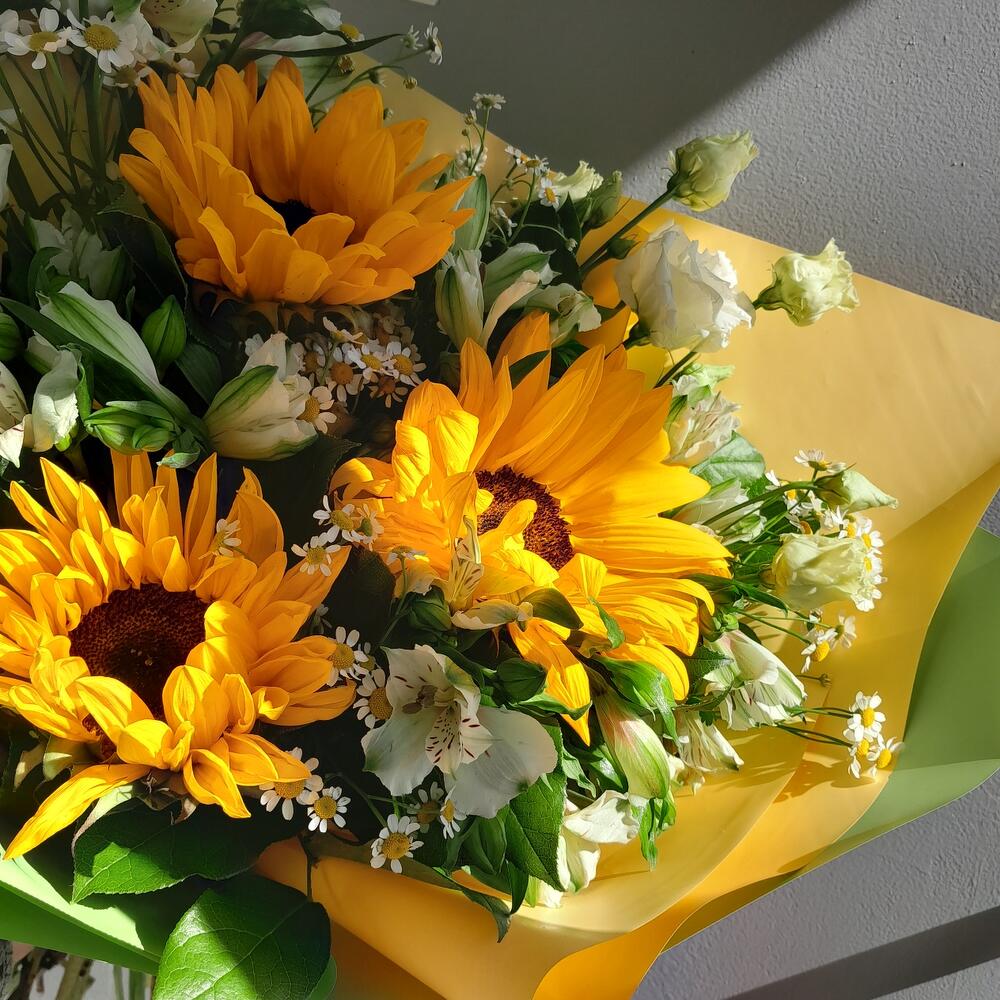 Подсолнух – 3 шт.Эустома – 2 шт.Матрикария (Ромашка Камила) – 5 шт.Альстромерия – 6 шт.Салал – 7 шт.Упаковка дизайнерская – 3 шт.Лента атласная – 2 шт.