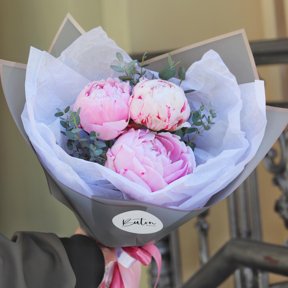 Букет-комплимент из розовых пионов с эвкалиптом