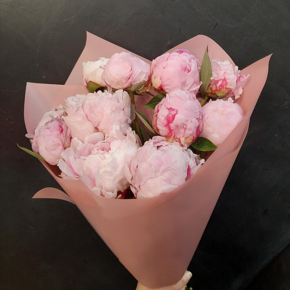 Лента атласная – 2 шт.Пион Сара Бернард – 11 шт.Калька упаковка – 1 шт.