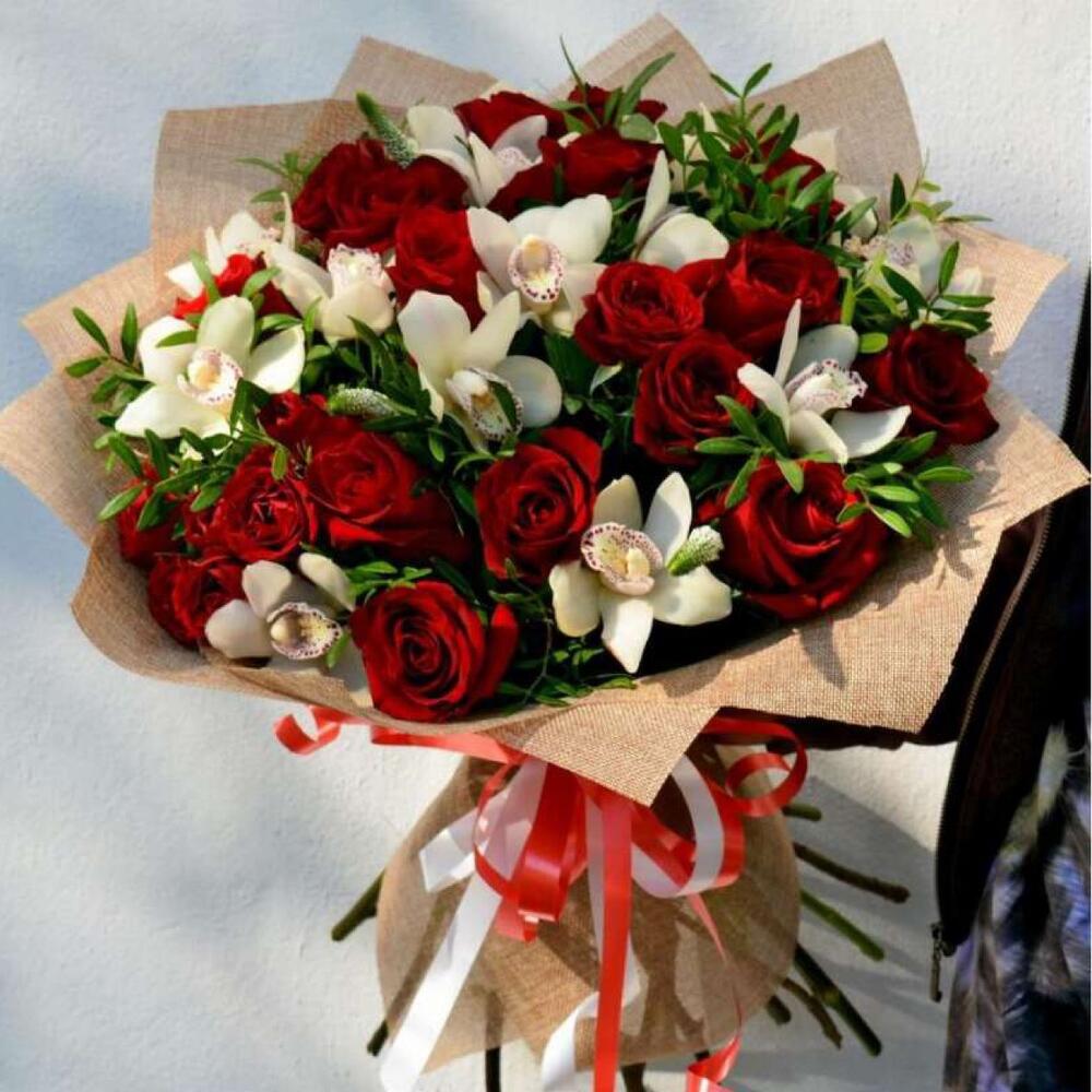 Роза красная 50 см – 19 шт.Орхидея ветка – 1 шт.Фисташка – 5 шт.крафтовая бумага – 1 шт.