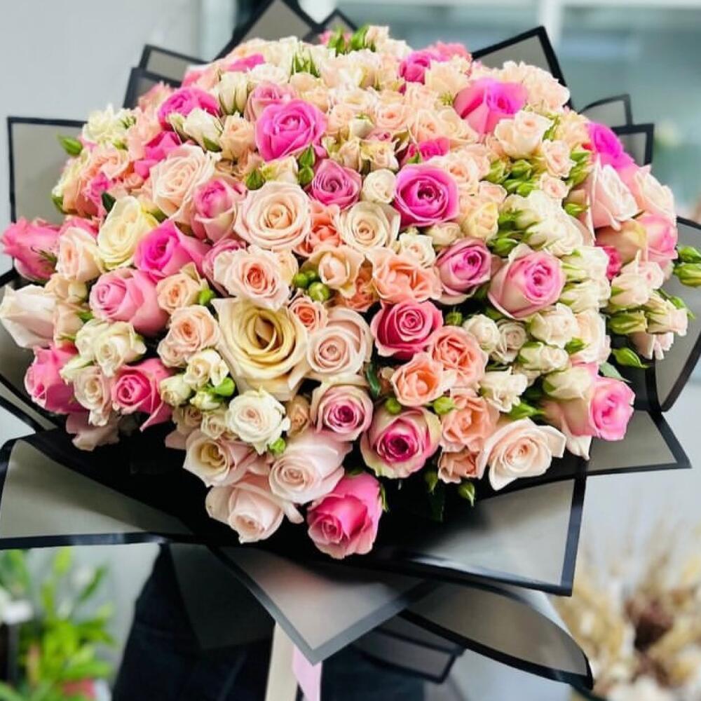 ассорти роз – 51 шт.Упаковка дизайнерская – 1 шт.Лента атласная – 2 шт.Открытка – 1 шт.инструкция по уходу за цветами – 1 шт.хорошее настроение – 100 шт.коробка переноска – 1 шт.Кризал – 1 шт.роза кустовая ассорти – 50 шт.