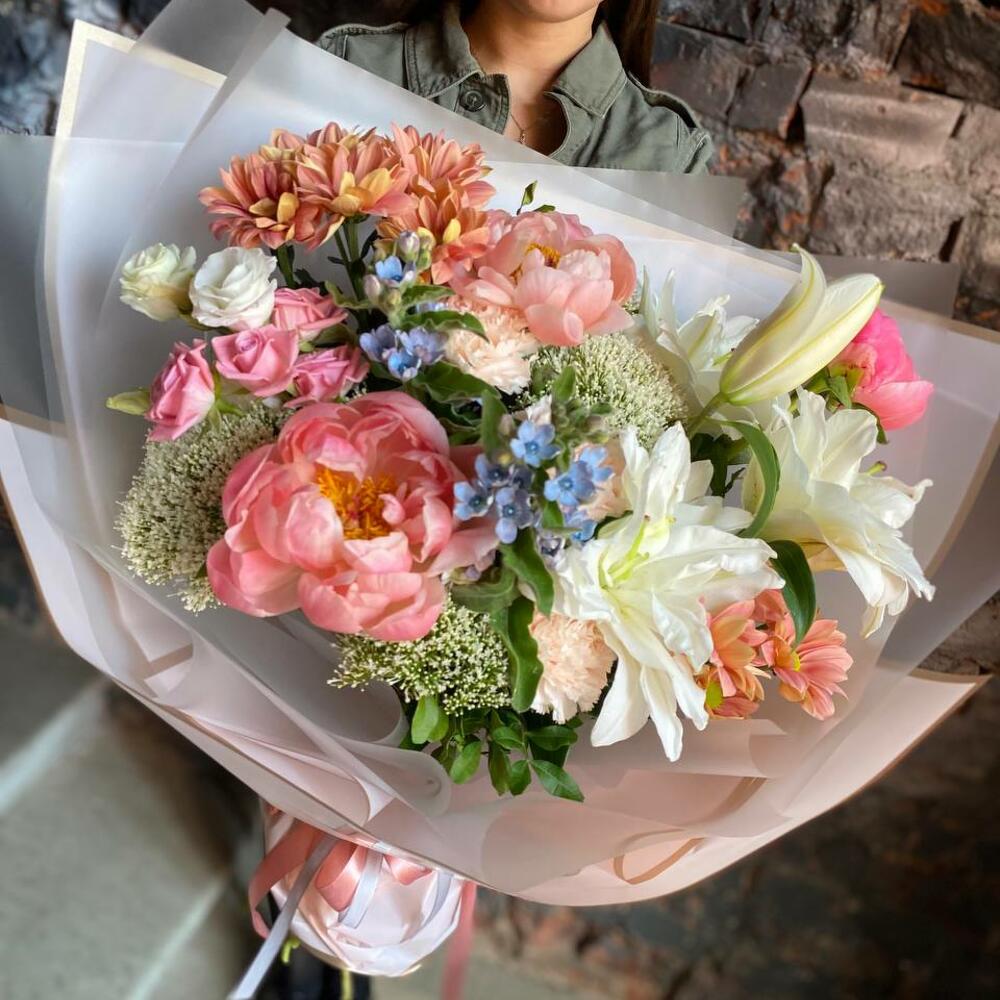 Букет из пионов, трахелиума, кустовых роз, гвоздики, эустомы, твидии, кустовой хризантемы и лилии в стильной упаковке “Офра”
