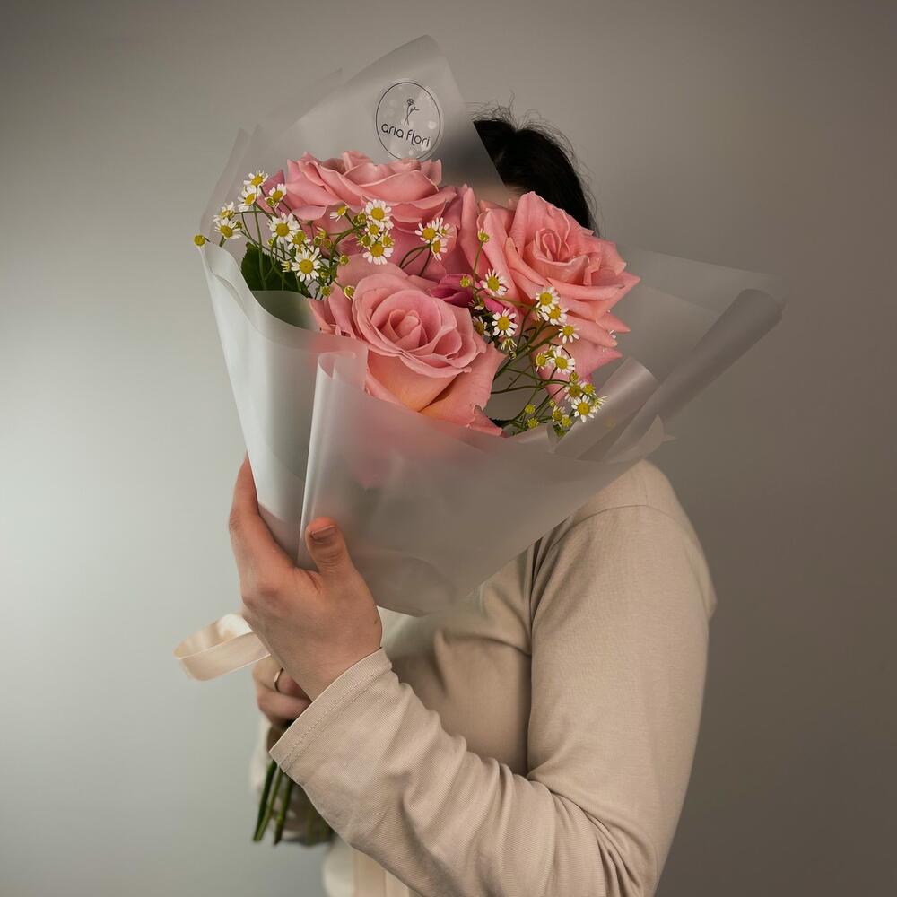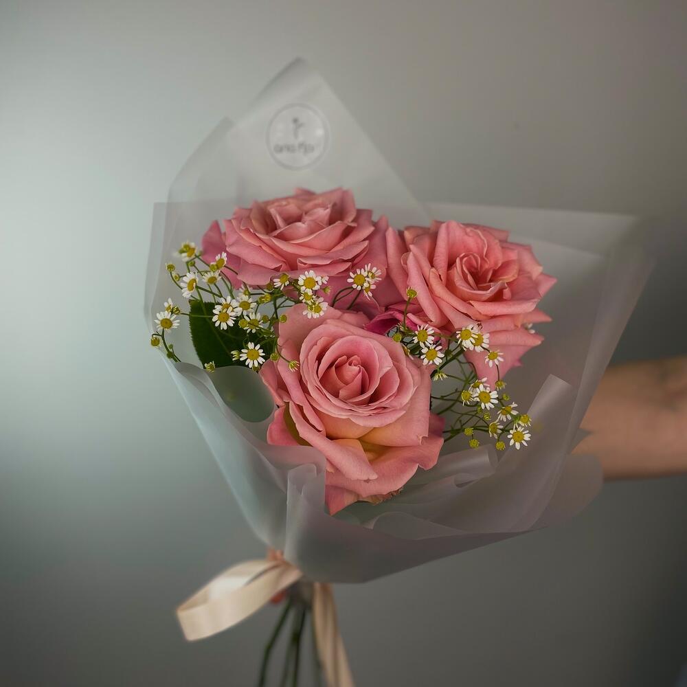 Матрикария – 3 шт.Упаковка дизайнерская – 1 шт.Эквадор роза – 3 шт.подкормка для срезанных цветов – 1 шт.любовь флориста – 100 шт.записка с вашим текстом – 1 шт.медиант ручной работ из бельгийского шоколада – 1 шт.