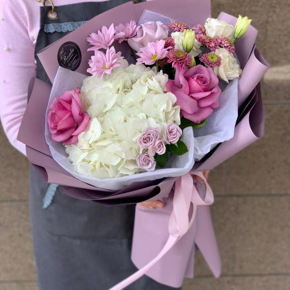 Альстромерии, Гортензии, Кустовые розы, Лизиантусы, Розы, Хризантемы