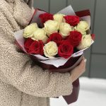 Роза красная – 8 шт. Роза белая – 7 шт. Оформление – 1 шт.