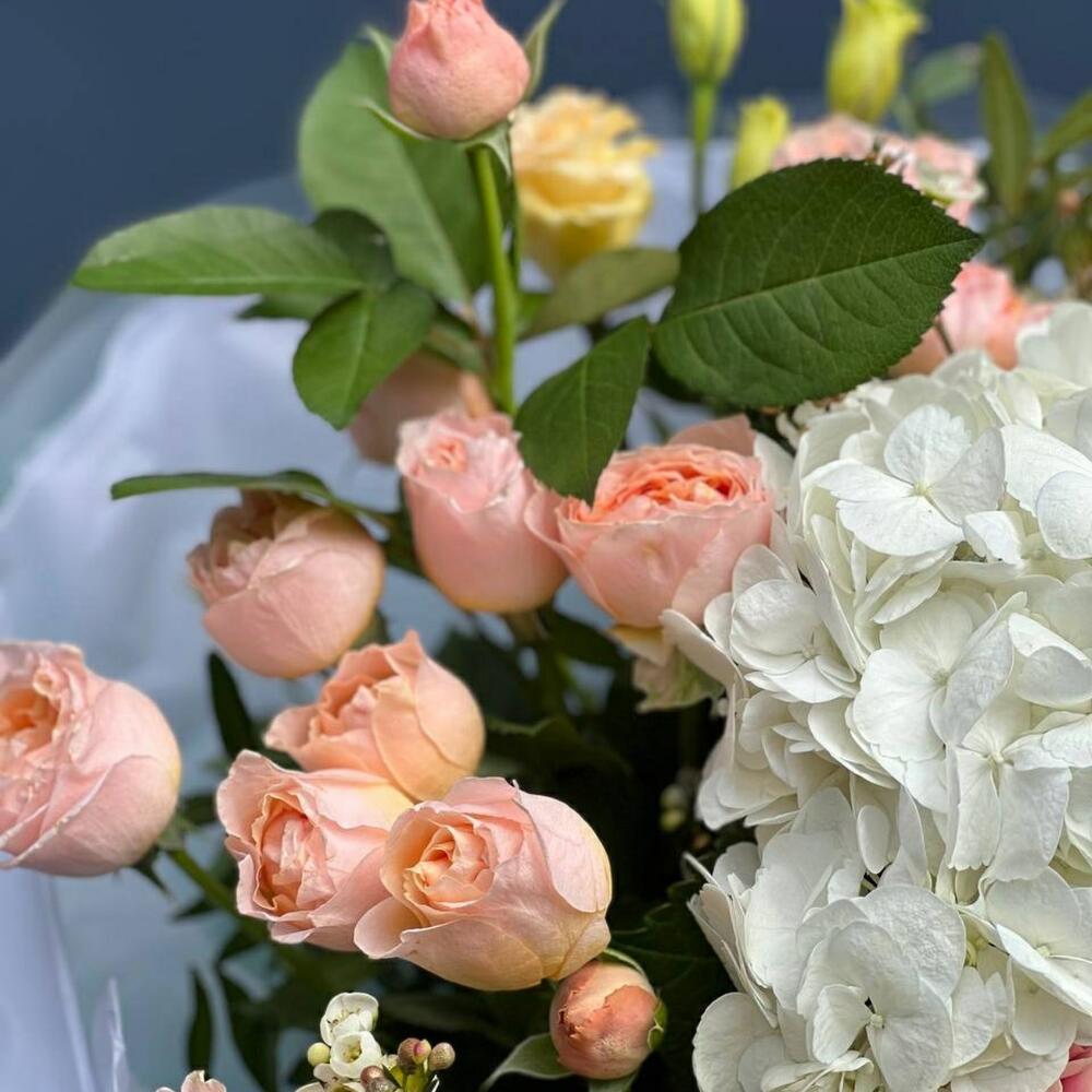 Гортензия – 1 шт. Лента – 1 шт. Хризантема кустовая – 1 шт. Эвкалипт – 3 шт. Эустома – 2 шт. Фисташка – 5 шт. Роза голландия – 3 шт. Упаковка дизайнерская – 7 шт. Роза пионовидная спрей – 3 шт.
