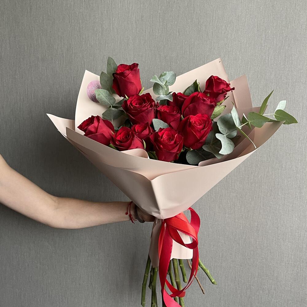 Роза – 11 шт. Эвкалипт – 3 шт. Упаковка – 1 шт. Атласная лента – 1 шт.
