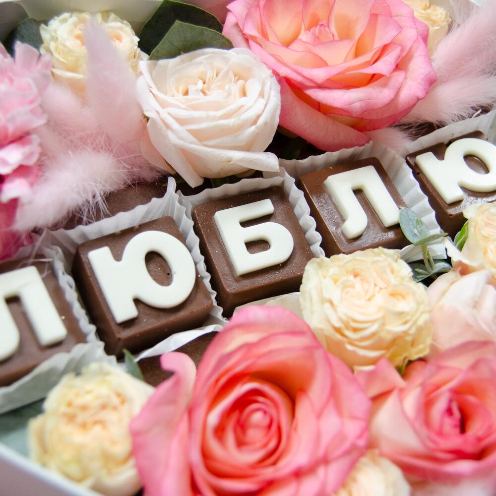 Шоколадные буквы – 5 шт. Коробка – 1 шт. Гвоздика – 1 шт. Роза кустовая – 3 шт. Роза сортовая – 3 шт.