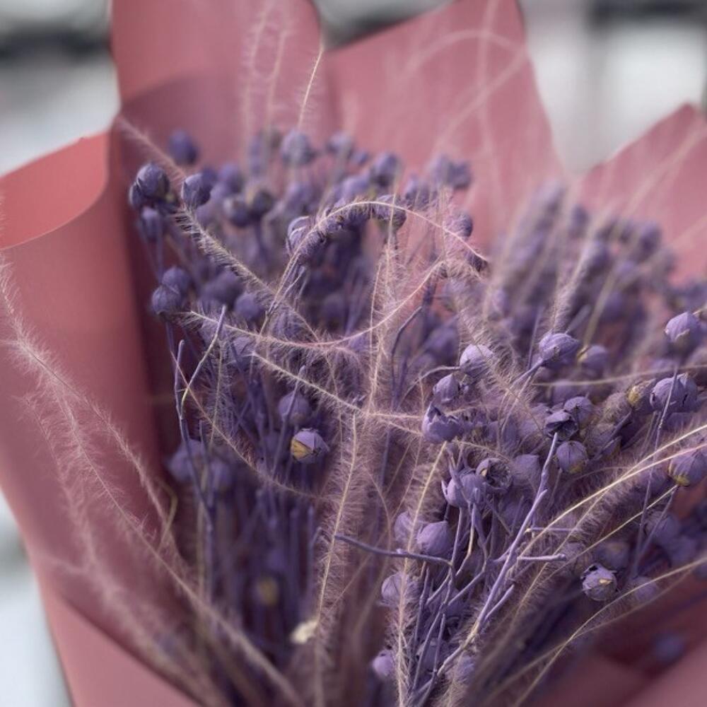 лëн сухоцвет – 10 шт.Ковыль – 9 шт.Упаковка дизайнерская – 4 шт.Лента атласная – 1 шт.