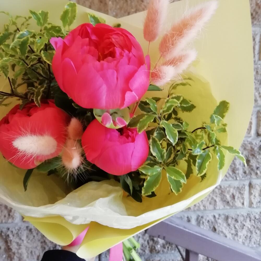 Пион – 3 шт.Лагурус (сухоцвет) – 2 шт.Питтоспорум – 1 шт.