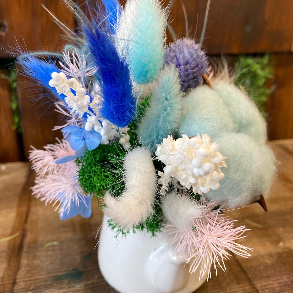 Сухоцветы – 7 шт.Лагурус (сухоцвет) – 25 шт.Хлопок – 3 шт.Кашпо керамическое – 1 шт.