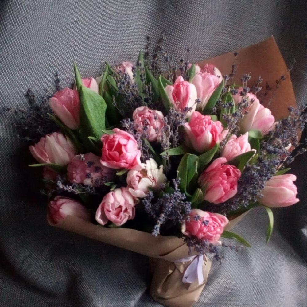 Тюльпан пионовидный – 25 шт.Лаванда (сухоцвет) – 175 шт.Крафт упаковка – 1 шт.Лента атласная – 1 шт.Пакет подарочный – 1 шт.