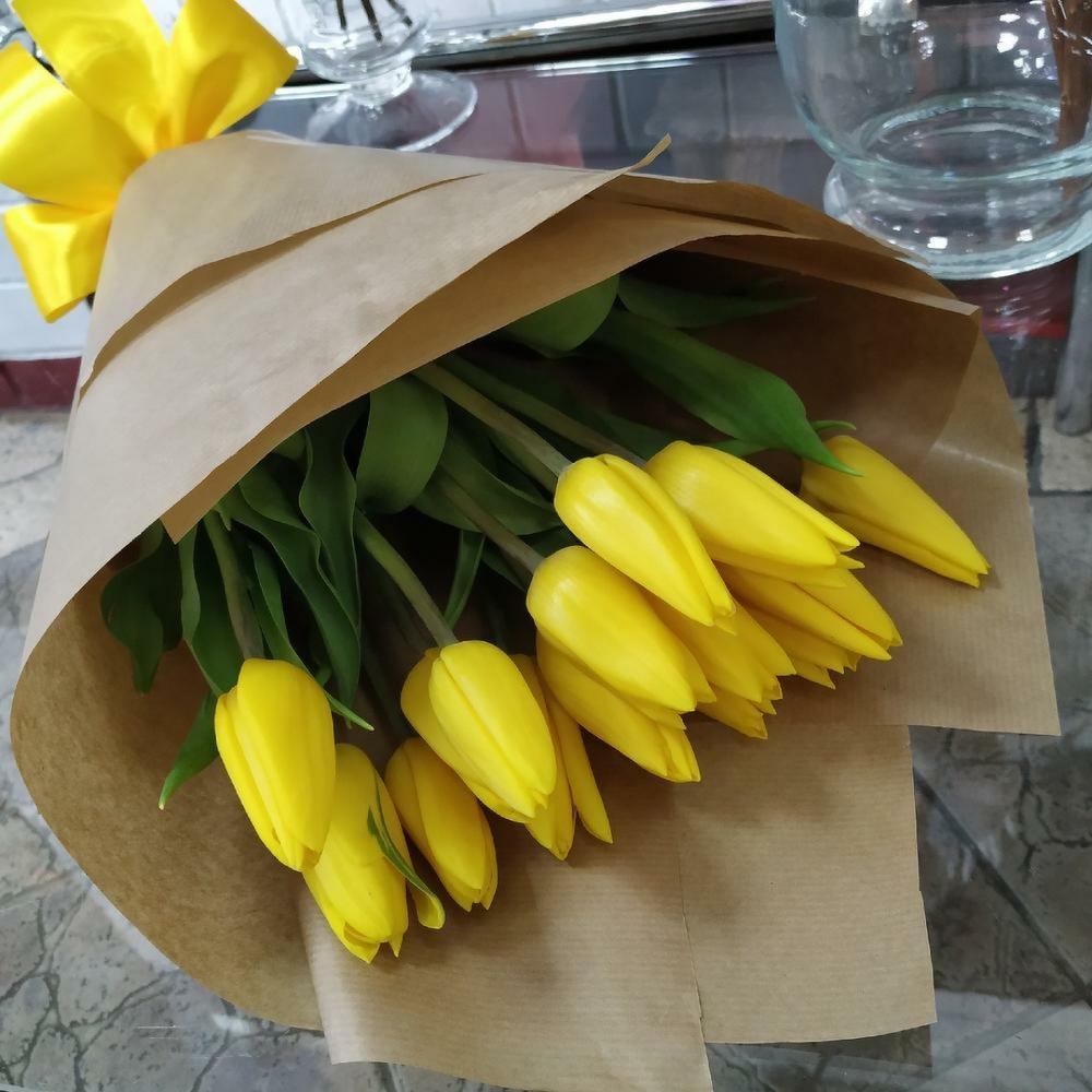 Букет 15 жёлтых тюльпанов в крафте