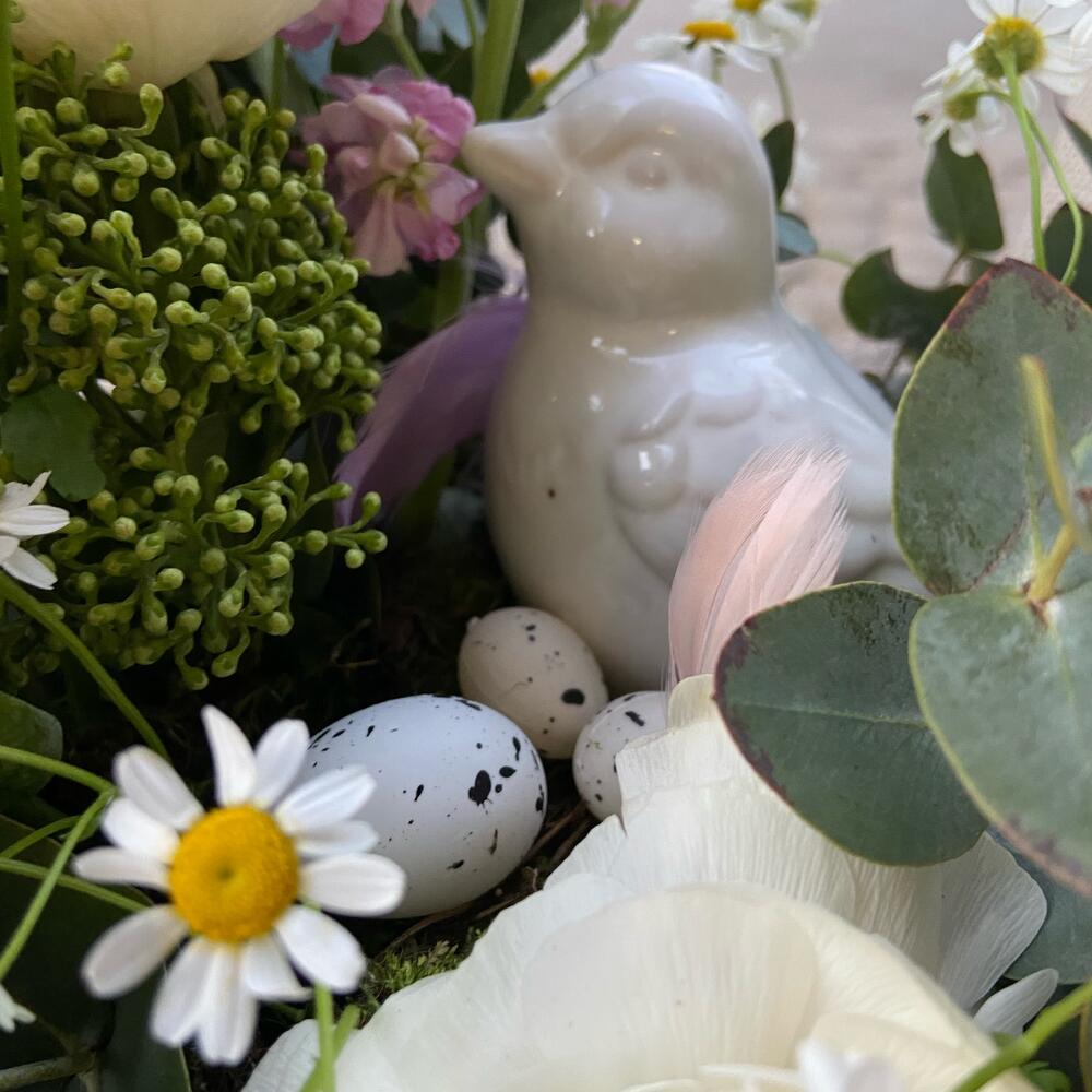 Верба – 3 шт.Корзина – 1 шт.Лизиантус – 1 шт.Тюльпан – 4 шт.Оазис – 1 шт.Матрикария – 1 шт.Фисташка – 2 шт.Птица декоративная – 1 шт.Хелеборус – 1 шт.березовые ветки – 3 шт.